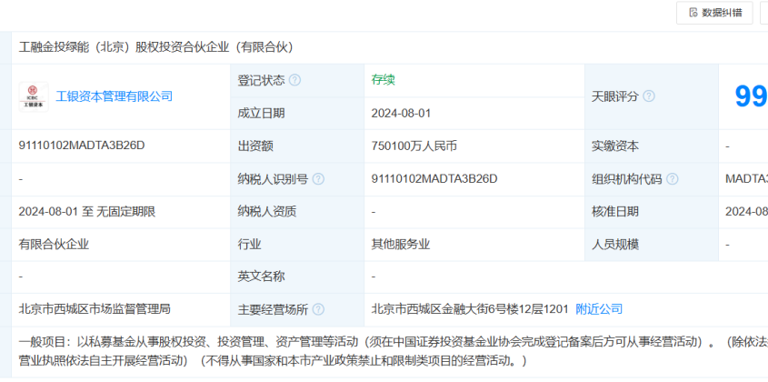 天眼查App顯示,工融金投綠能(北京)股權(quán)投資合伙企業(yè)(有限合伙)近日成立,執(zhí)行事務合伙人為工銀資本管理有限公司,出資額...