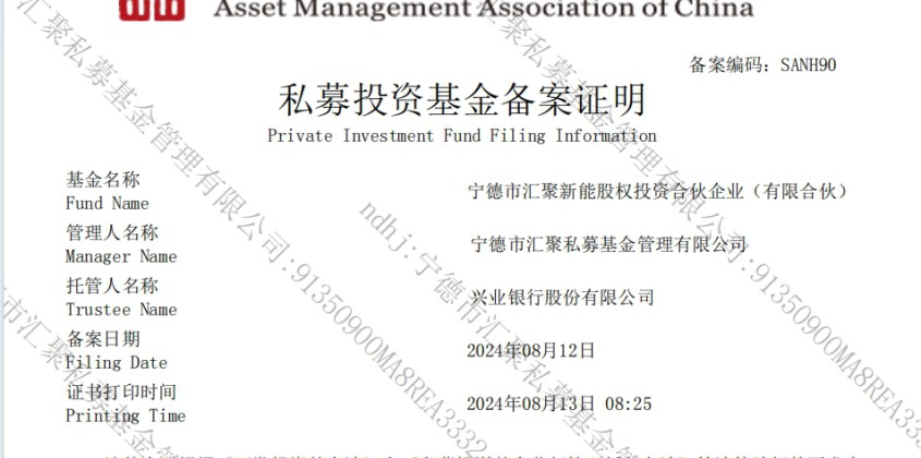 投資界(ID:pedaily2012)消息,8月12日,寧德市匯聚新能股權(quán)投資合伙企業(yè)(有限合伙)完成中國證券投資基金業(yè)協(xié)會(huì)備案工作。...