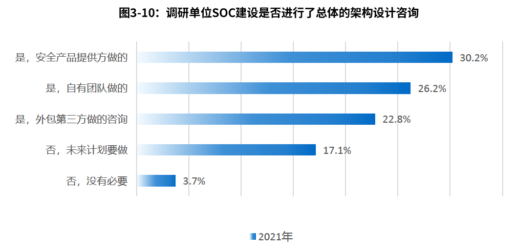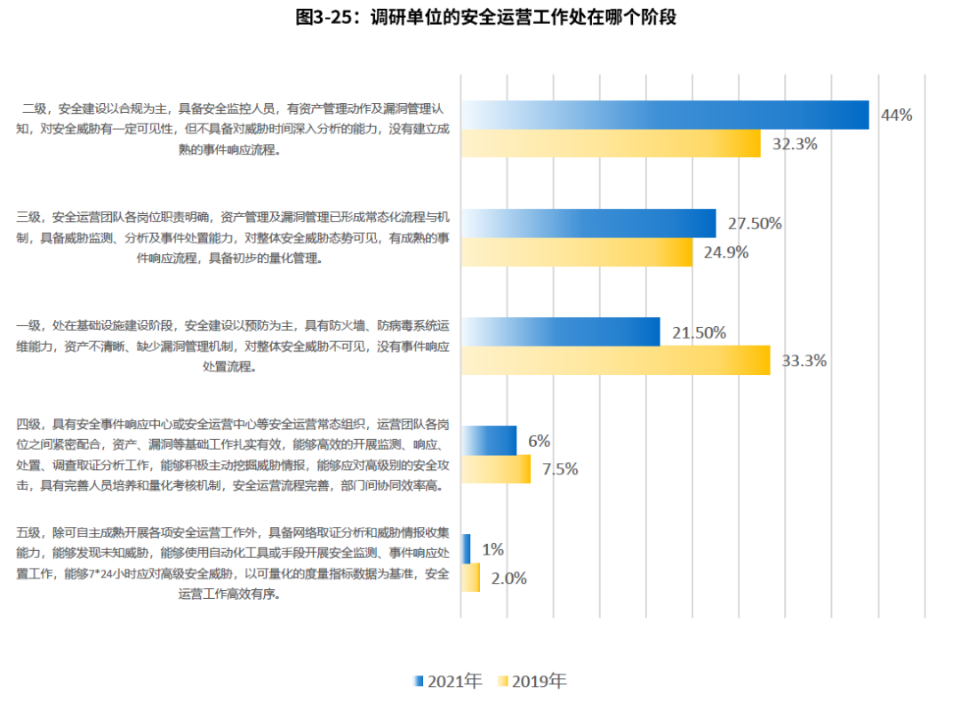 從報告中看出,2021年88.6%的企業(yè)已經(jīng)建立安全運(yùn)營中心,與2020年79.5%和2019年68.2%相比,呈持續(xù)增長態(tài)勢,越來越多的行業(yè)開始重視安全運(yùn)營中心建設(shè)。且成熟度處于二級和三級的企業(yè)數(shù)量明顯增加。