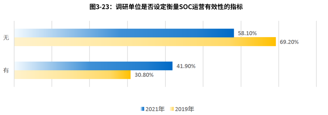網(wǎng)絡(luò)安全是一個高投入但產(chǎn)出不明顯的工作,制定安全運(yùn)營評價指標(biāo),定期對各項(xiàng)工作進(jìn)行有效性評價,可以量化體現(xiàn)安全運(yùn)營效果。從調(diào)研中看出,設(shè)定有效性評價指標(biāo)的企業(yè)占比由上次的30.8%增長到41.9%。
