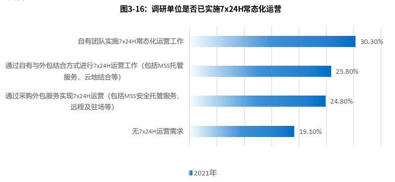 從報告中看出,有80.9%的企業(yè)都實(shí)施了7*24常態(tài)化運(yùn)營。采購?fù)泄苓\(yùn)營服務(wù)的企業(yè)相對較多,占比達(dá)65.8%,僅有34.2%的企業(yè)完全沒有托管運(yùn)營需求。通過7*24小時托管服務(wù)實(shí)現(xiàn)檢測及響應(yīng)效率提升,已經(jīng)成為越來越多客戶的選擇。