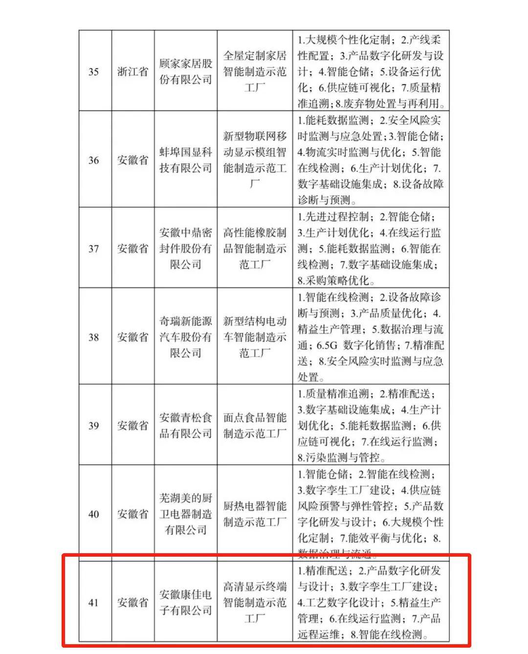 1月3日,國家工信部、發(fā)改委、財政部、市監(jiān)總局等四部門聯(lián)合公布2022年度智能制造示范工廠揭榜單位和優(yōu)秀場景名單,安徽康佳電子有限公司名列其中,成為全國99個國家級智能制造示范工廠之一。