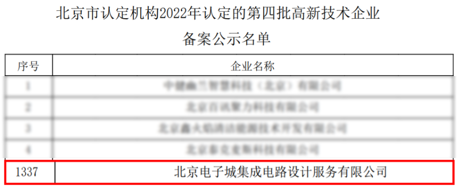 近日,全國(guó)高新技術(shù)企業(yè)認(rèn)定管理工作領(lǐng)導(dǎo)小組辦公室發(fā)布《2022年第四批國(guó)家高新技術(shù)企業(yè)認(rèn)證名單》,電子城(600658)高科科技研發(fā)服務(wù)重要支撐載體——電子城集成電路服務(wù)公司位列其中,正式邁入國(guó)家高新技術(shù)企業(yè)行列。
