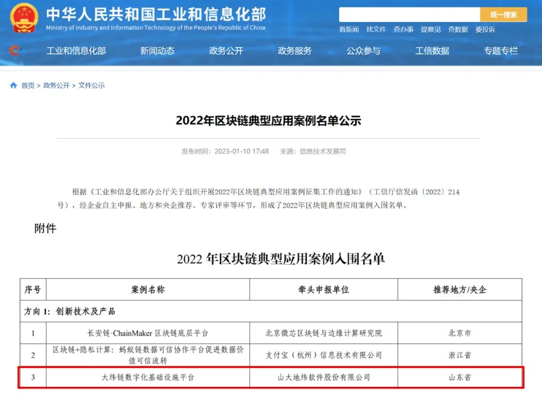 1月10日,國家工業(yè)和信息化部公示了《2022年區(qū)塊鏈典型應(yīng)用案例》名單,由山大地緯牽頭申報的“大緯鏈數(shù)字化基礎(chǔ)設(shè)施平臺”成功入選,以優(yōu)秀的成績位居榜單前三。