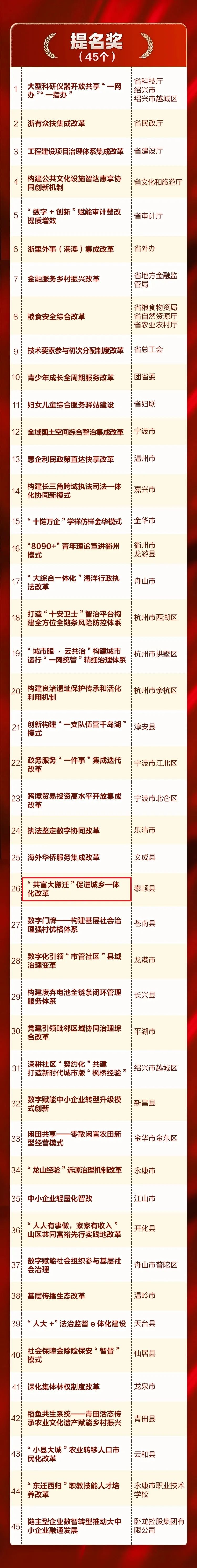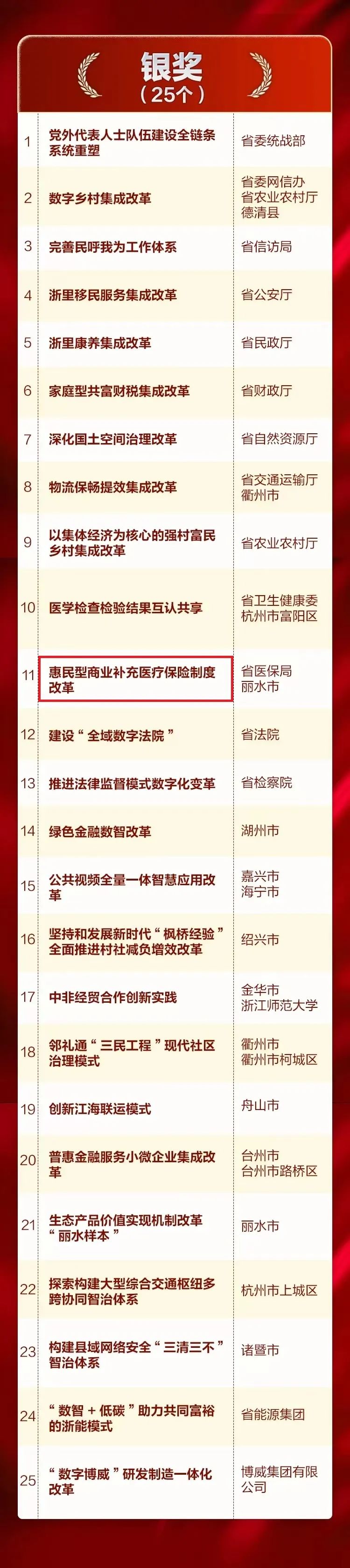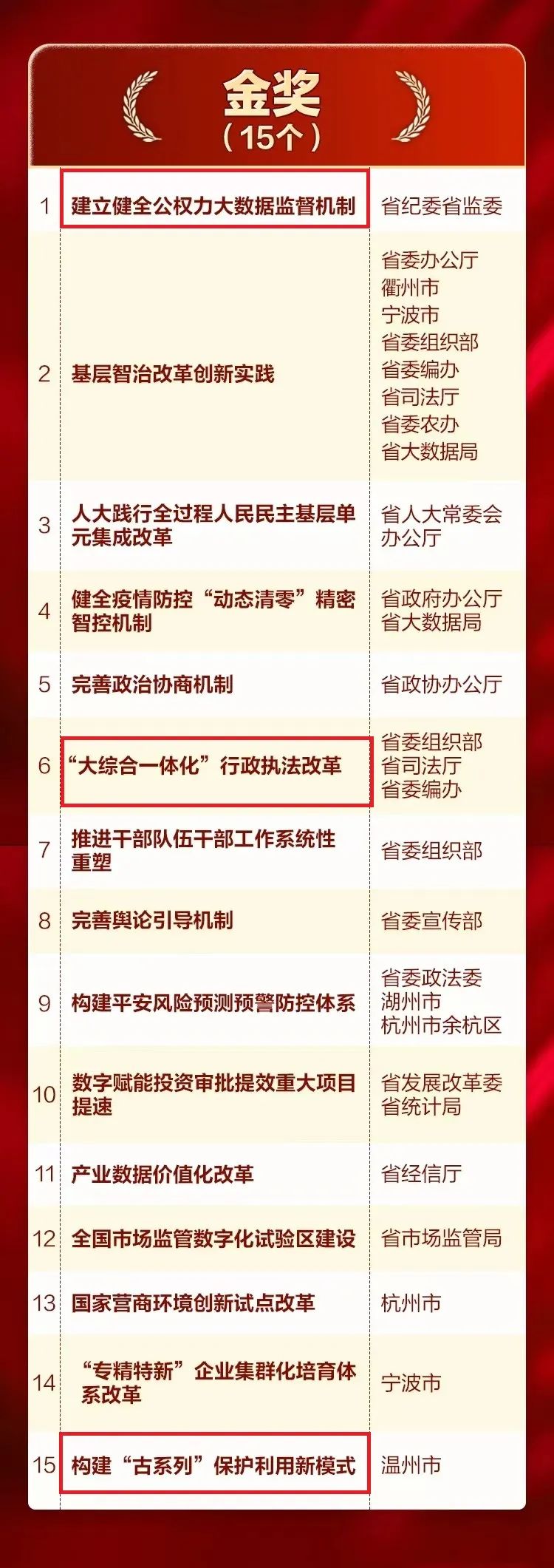 其中,由省委組織部、省司法廳、省委編辦主導,匯信科技提供技術(shù)支持與服務的“大綜合一體化”行政執(zhí)法改革榮獲金獎,網(wǎng)新軟件參與打造的“建立健全公權(quán)力大數(shù)據(jù)監(jiān)督機制”、“構(gòu)建‘古系列’保護利用新模式兩個項目榮獲金獎;網(wǎng)新軟件承建的“惠民型商業(yè)補充醫(yī)療保險制度改革”項目榮獲銀獎;“共富大搬遷”促進城鄉(xiāng)一體化改革項目榮獲提名獎。