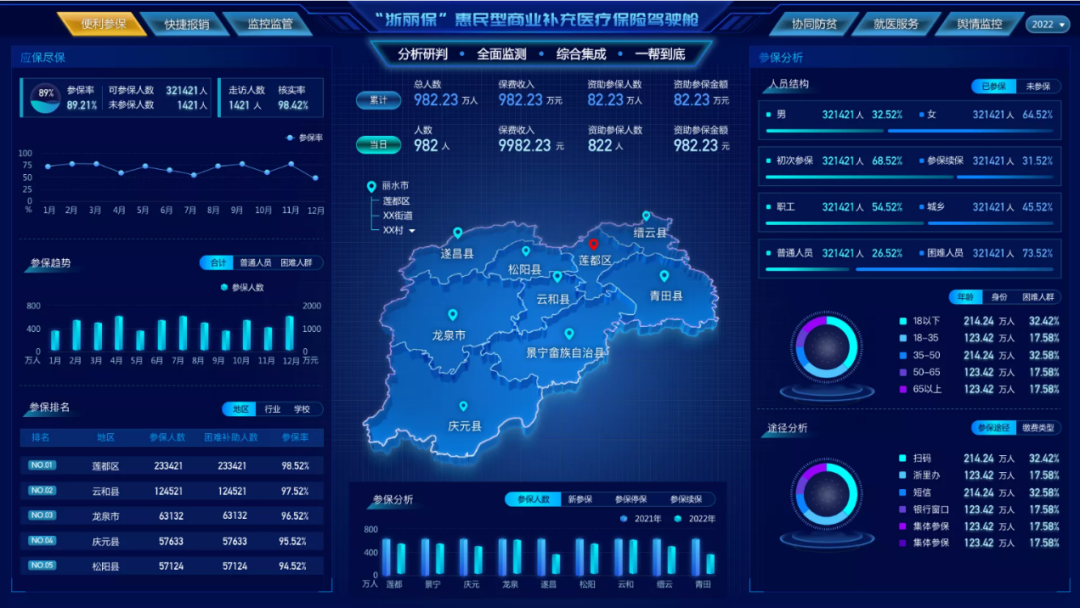 網(wǎng)新軟件承建的“浙里惠民?!表椖?,借助大數(shù)據(jù)、算法引擎等數(shù)字化技術(shù),對參保、報銷、監(jiān)控監(jiān)管、協(xié)同防貧就醫(yī)服務、輿情監(jiān)控等業(yè)務進行重塑,推動業(yè)務流程再造。通過聚焦群眾、企業(yè)、政府高頻需求,創(chuàng)建“1+2+6”數(shù)字化架構(gòu),即1個駕駛艙,浙政釘和浙里辦兩端應用,以及便利參保等6個場景應用,建立多跨協(xié)同聯(lián)動機制,協(xié)同機關(guān)單位、銀行保險、定點醫(yī)藥機構(gòu)等上千余家行政機關(guān)、企事業(yè)單位歸集538項數(shù)據(jù),形成551項指標體系,通過流程重塑、數(shù)據(jù)貫通,全面提升服務效能和治理效率。