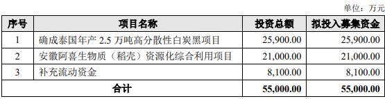 本次擬發(fā)行可轉(zhuǎn)換公司債券募集資金總額不超過人民幣5.5億元(含),扣除發(fā)行費用后,募集資金擬用于確成泰國年產(chǎn)2.5萬噸高分散性白炭黑項目、安徽阿喜生物質(zhì)(稻殼)資源化綜合利用項目、補充流動資金。