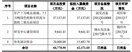 確成股份募集資金總額為7.01億元,扣除發(fā)行費用后,募集資金凈額為6.25億元。其中,3.71億元用于年產(chǎn)7萬噸水玻璃、7.5萬噸綠色輪胎專用高分散性二氧化硅項目,9641.85萬元用于研發(fā)中心建設(shè)項目,1.57億元用于補充流動資金。
