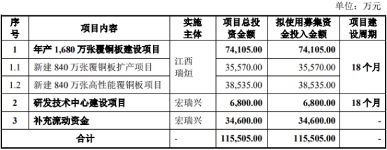 宏瑞興原擬在深交所主板公開發(fā)行股票總量不超過3,333.3334萬股,占發(fā)行后總股本的比例不低于25.00%。公司擬募集資金115,505.00萬元,分別用于年產(chǎn)1,680萬張覆銅板建設(shè)項(xiàng)目、研發(fā)技術(shù)中心建設(shè)項(xiàng)目、補(bǔ)充流動(dòng)資金。