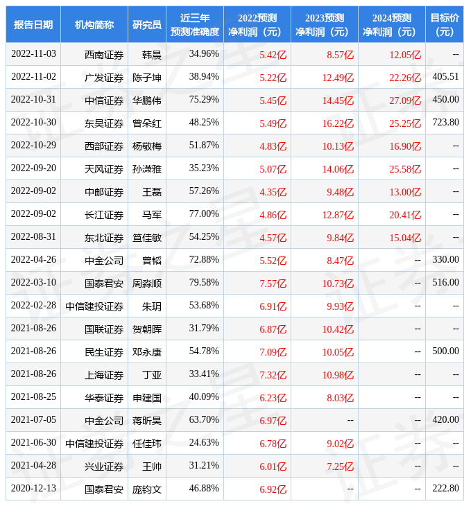 最新盈利預(yù)測明細(xì)如下: