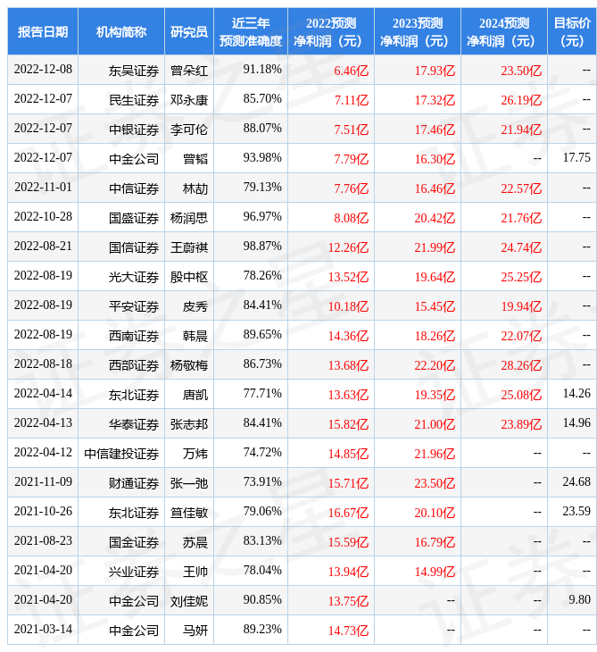 數(shù)據(jù)中心根據(jù)近三年發(fā)布的研報數(shù)據(jù)計算,國信證券王蔚祺研究員團隊對該股研究較為深入,近三年預測準確度均值高達98.87%,其預測2022年度歸屬凈利潤為盈利12.26億,根據(jù)現(xiàn)價換算的預測PE為23.68。
