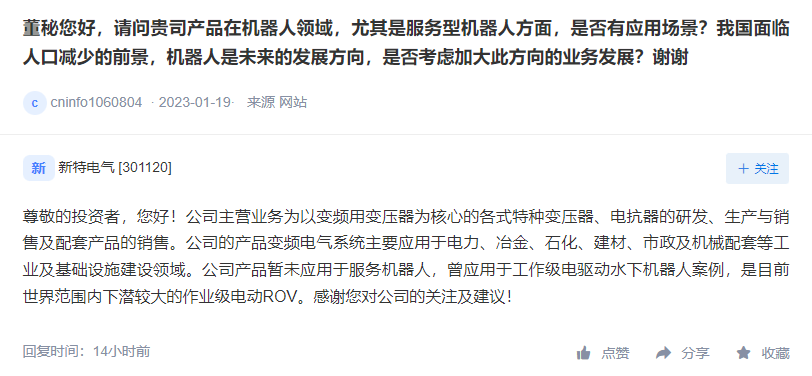 中國財富通1月29日-新特電氣(301120)在互動平臺上表示,公司主營業(yè)務(wù)為以變頻用變壓器為核心的各式特種變壓器、電抗器的研發(fā)、生產(chǎn)與銷售及配套產(chǎn)品的銷售。公司的產(chǎn)品變頻電氣系統(tǒng)主要應(yīng)用于電力、冶金、石化、建材、市政及機(jī)械配套等工業(yè)及基礎(chǔ)設(shè)施建設(shè)領(lǐng)域。公司產(chǎn)品暫未應(yīng)用于服務(wù)機(jī)器人,曾應(yīng)用于工作級電驅(qū)動水下機(jī)器人案例,是目前世界范圍內(nèi)下潛較大的作業(yè)級電動ROV。