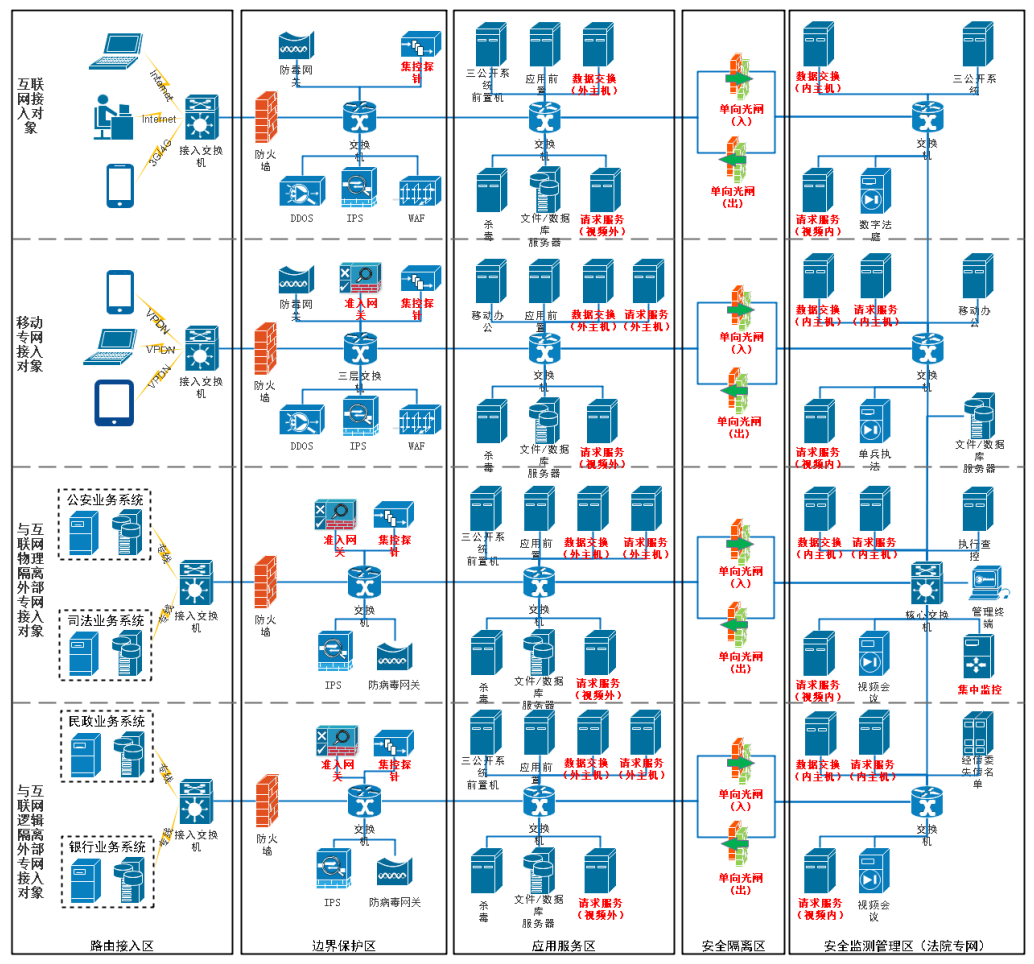 1、互聯(lián)網(wǎng)接入對象:主要實現(xiàn)對互聯(lián)網(wǎng)數(shù)據(jù)的采集和對外發(fā)布安全數(shù)據(jù)傳輸,如網(wǎng)站、文書發(fā)布系統(tǒng)、互聯(lián)網(wǎng)庭審、案件查詢系統(tǒng)等。