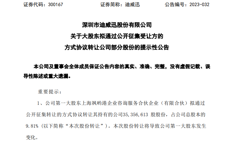 2月8日,迪威迅(300167)收到第一大股東上海颯喲港企業(yè)咨詢服務(wù)合伙企業(yè)(有限合伙)(下稱“上海颯喲港”)的通知,上海颯喲港擬以公開征集轉(zhuǎn)讓的方式,協(xié)議轉(zhuǎn)讓其所持有公司3535.7萬股股份(占公司總股本9.81%),本次公開征集轉(zhuǎn)讓的價(jià)格不低于5.80元/股。