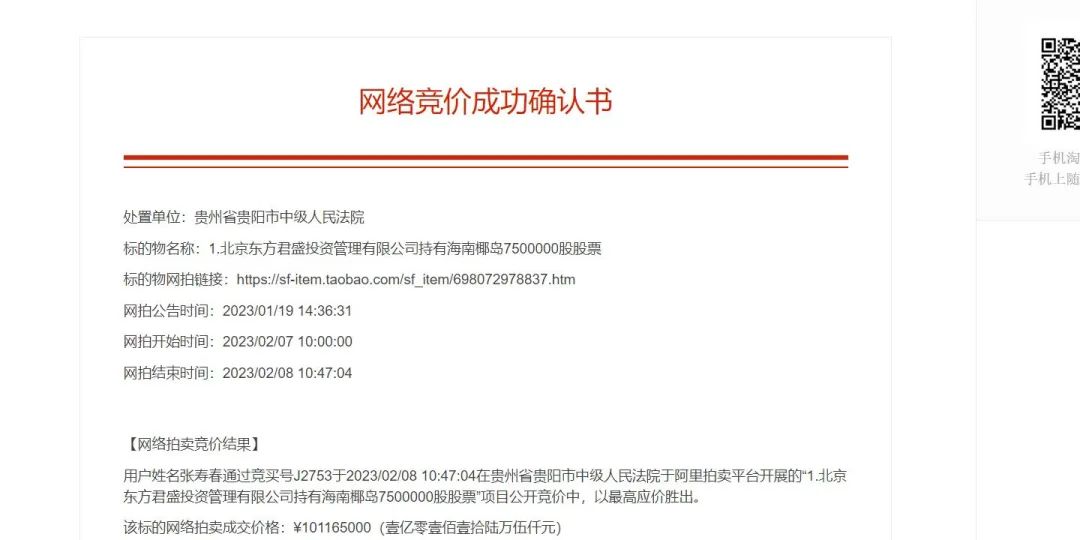 在首次拍賣無人問津后,海南椰島(600238)大股東東方君盛所持部分股票在二拍中已被一位叫張壽春的自然人拿下。