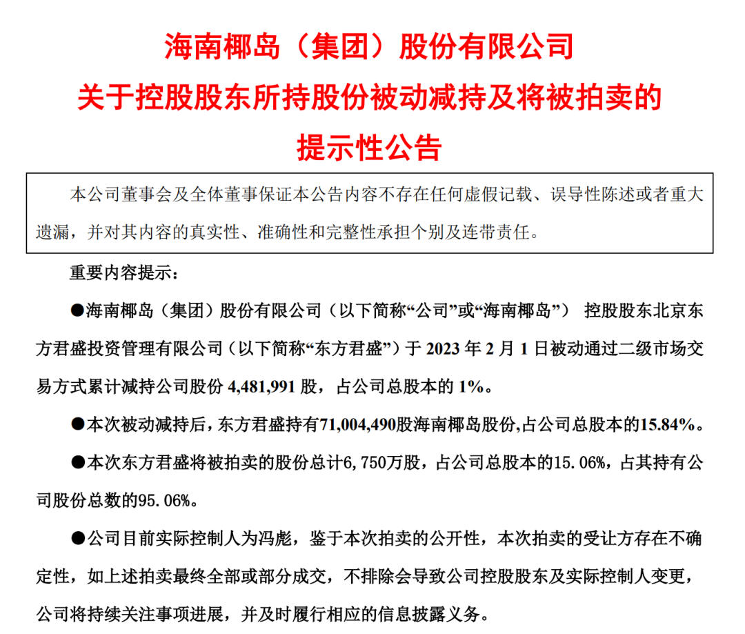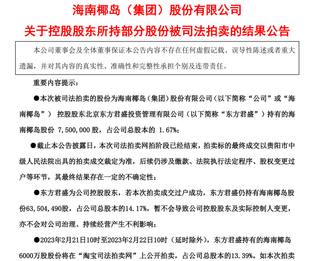 實際上,這已經(jīng)不是東方君盛所持股份的首次拍賣。海南椰島此前公告稱,貴陽中級人民法院已于2023年1月1日拍賣東方君盛所持公司全部7568.64萬股,占公司總股本的16.84%。不過至1月4日,首次拍賣標的物已流拍,流拍原因系無人出價。