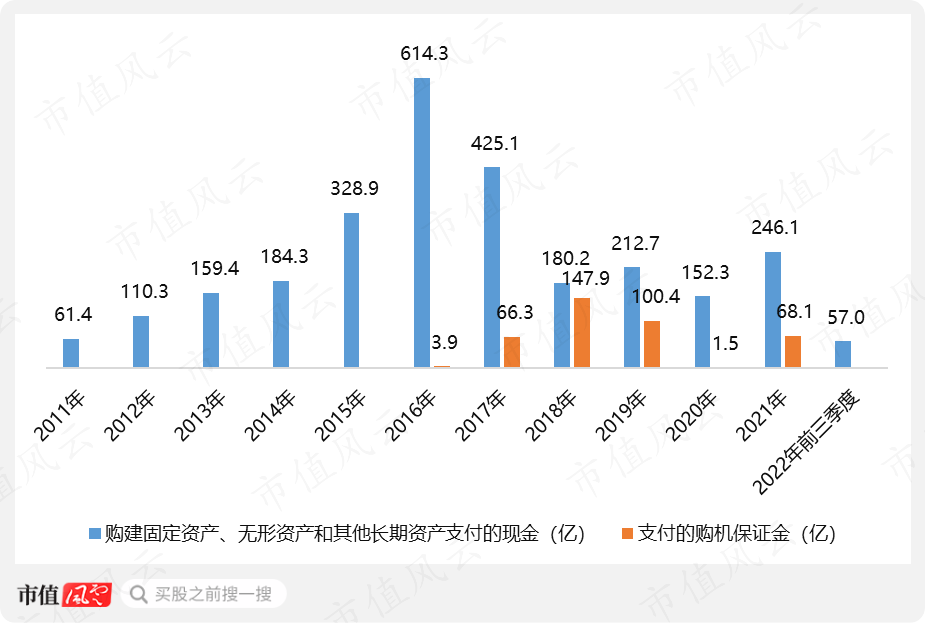 此外,為了維持規(guī)模領(lǐng)先,渤海租賃每年還在不停購置新集裝箱和新飛機,2011年至2022年前三季度,其現(xiàn)金流量表中“購建固定資產(chǎn)、無形資產(chǎn)和其他長期資產(chǎn)支付的現(xiàn)金”加上“支付的購機保證金”共計3,120億。