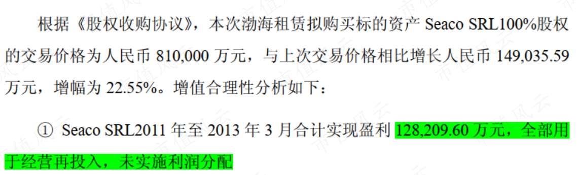 2013年9月,渤海租賃又以81億總對價自海航集團手中取得Seaco SRL100%股權(quán),其中支付現(xiàn)金高達(dá)72億,另承接9億債務(wù),并募集35億元配套資金。