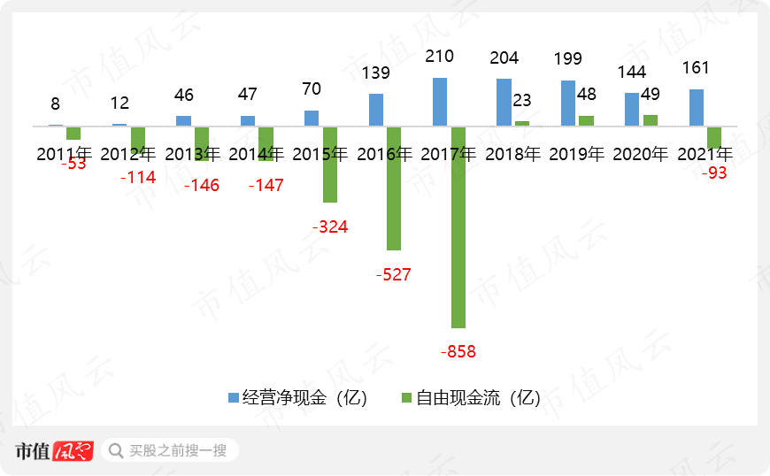 (本圖中自由現(xiàn)金=經(jīng)營凈現(xiàn)金+資產(chǎn)處置-資產(chǎn)購置-子公司并購-支付的購機保證金。制圖:市值風(fēng)云APP)