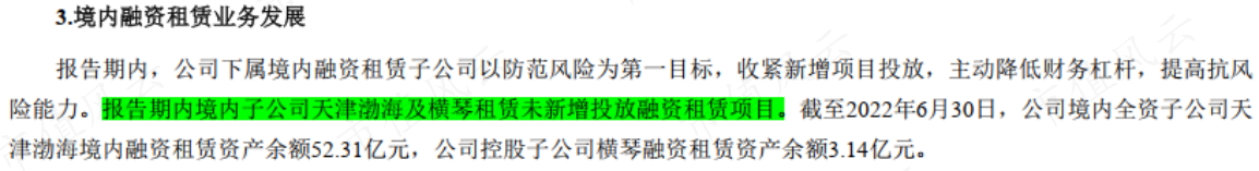 截至2022年6月30日,渤海租賃境內(nèi)全資子公司天津渤海境內(nèi)融資租賃資產(chǎn)余額52.31億元,公司控股子公司橫琴融資租賃資產(chǎn)余額3.14億元。