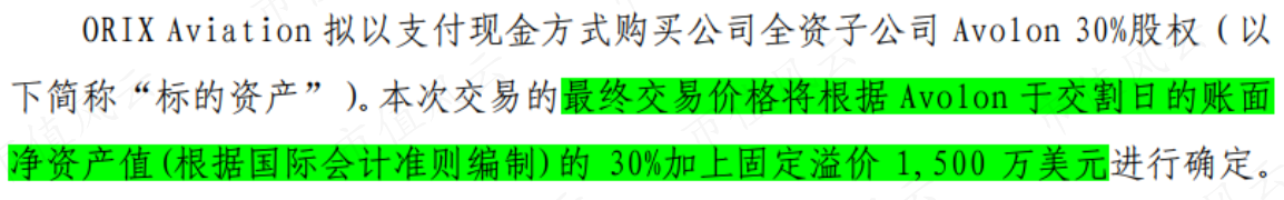 以Avolon為例,2018年8月,取得Avolon 100%股權(quán)兩年后,渤海租賃為降低資產(chǎn)負(fù)債率,對外轉(zhuǎn)讓Avolon 30%的股權(quán),而此時定價依據(jù)是Avolon交割日賬面凈資產(chǎn)的30%加固定溢價1,500萬美元。