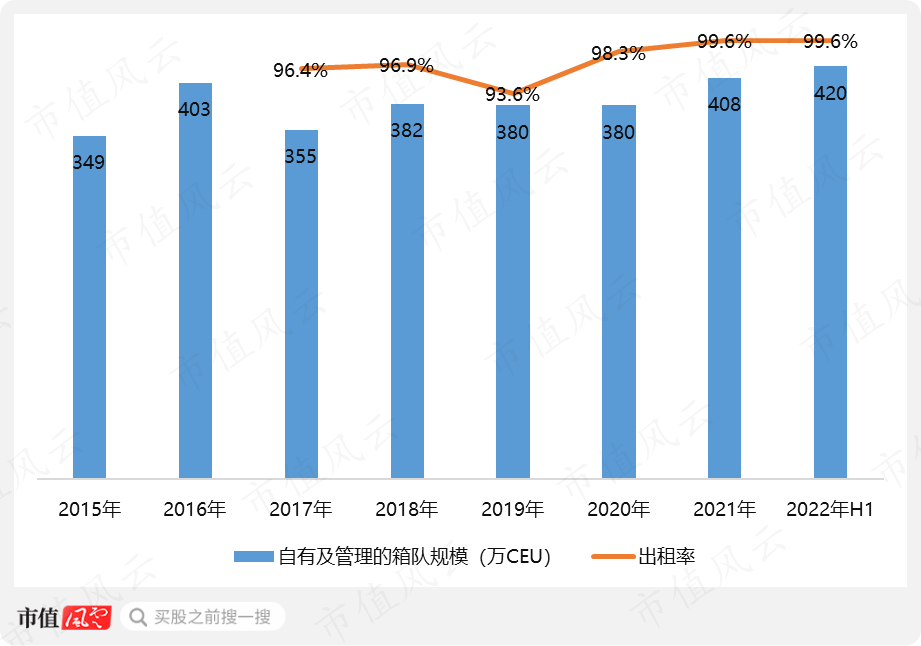 2021年及2022年上半年,集裝箱業(yè)務(wù)營收均有相對較明顯的增長,分別增長4.9%和10.2%,一是由于集裝箱航運行業(yè)需求井噴,行業(yè)景氣度提升導(dǎo)致集裝箱出租率顯著提升。