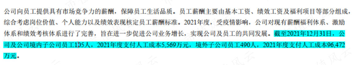 而管理層工資遠(yuǎn)低于職工平均工資,也是由業(yè)務(wù)主要在境外開展導(dǎo)致的:以2021年為例,境內(nèi)員工105人,人均工資成本53萬;境外員工490人,人均工資成本197萬。