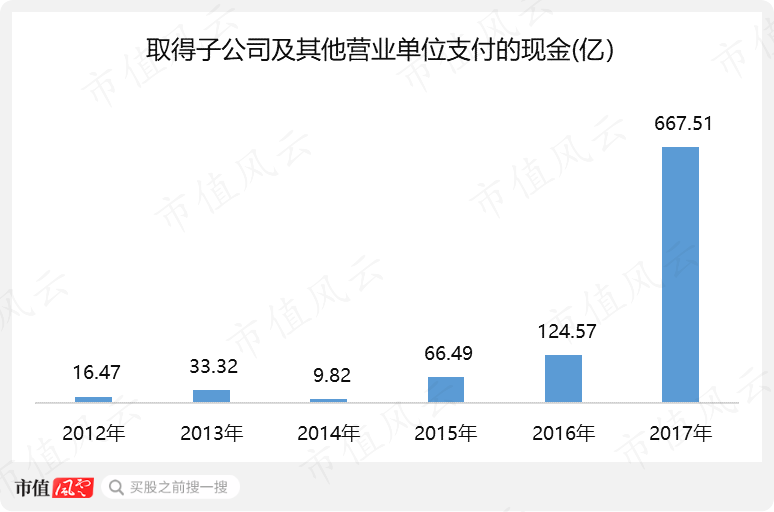 2012至2017年,單單在現(xiàn)金流量表中列示的,取得子公司及其他營業(yè)單位支付的現(xiàn)金就高達(dá)918億。