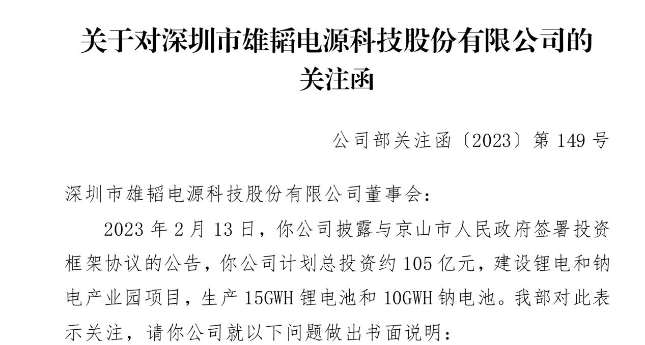 2月14日,市值80多億的雄韜股份(002733)收到深交所關(guān)注函,起因是一則擬將用105億投資鋰電和鈉電的消息。
