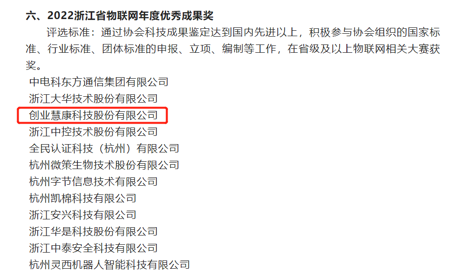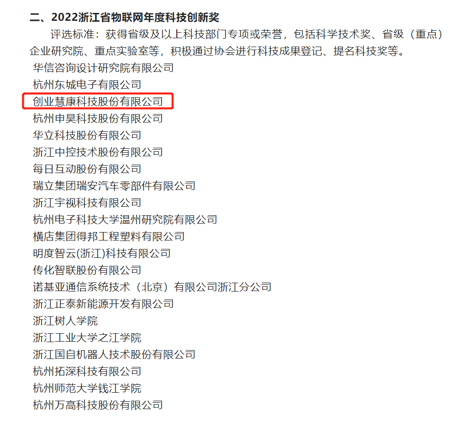 近日,浙江省物聯(lián)網(wǎng)產(chǎn)業(yè)協(xié)會公布了《關于2022浙江省級物聯(lián)網(wǎng)年度獎項候選單位的公示》名單,創(chuàng)業(yè)慧康(300451)憑借在物聯(lián)網(wǎng)領域的突出表現(xiàn)和創(chuàng)新能力,榮獲2022浙江省物聯(lián)網(wǎng)年度“科技創(chuàng)新獎”和“優(yōu)秀成果獎”兩項榮譽。