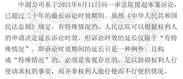 近日,該案迎來(lái)終審判決。法院認(rèn)定,中潤(rùn)公司怠于行使自身權(quán)利,已超過(guò)20年的最長(zhǎng)訴訟時(shí)效,遂駁回中潤(rùn)公司訴訟。