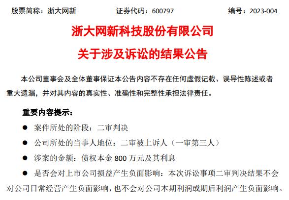2023年2月16日,浙大網(wǎng)新發(fā)布公告稱,本次訴訟事項(xiàng)二審判決結(jié)果不會(huì)對(duì)公司日常經(jīng)營(yíng)產(chǎn)生負(fù)面影響,也不會(huì)對(duì)公司本期利潤(rùn)或期后利潤(rùn)產(chǎn)生負(fù)面影響。