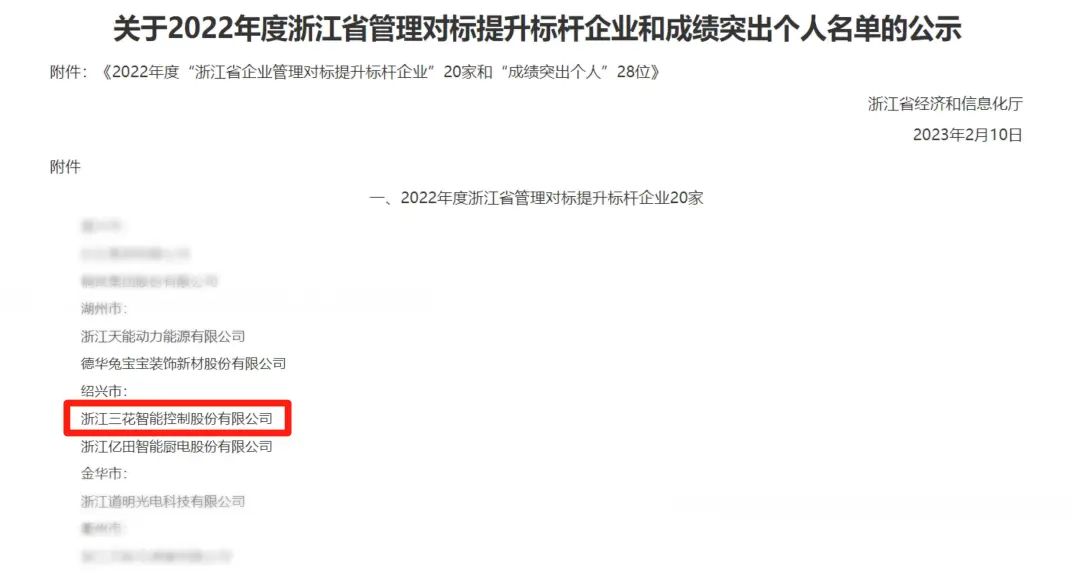 2月13日,浙江省經(jīng)信廳公布了2022年度浙江省管理對標(biāo)提升標(biāo)桿企業(yè)名單,認(rèn)定20家企業(yè)為“浙江省管理對標(biāo)提升標(biāo)桿企業(yè)”,三花智控(002050)榮登榜單。