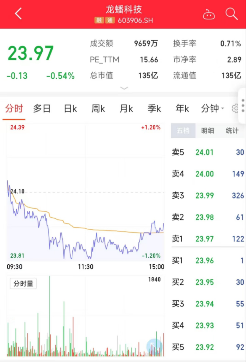 同花順(300033)數(shù)據(jù)顯示,截至2月24日收盤,龍蟠科技報23.97元/股,跌0.54%,總市值為135億元。
