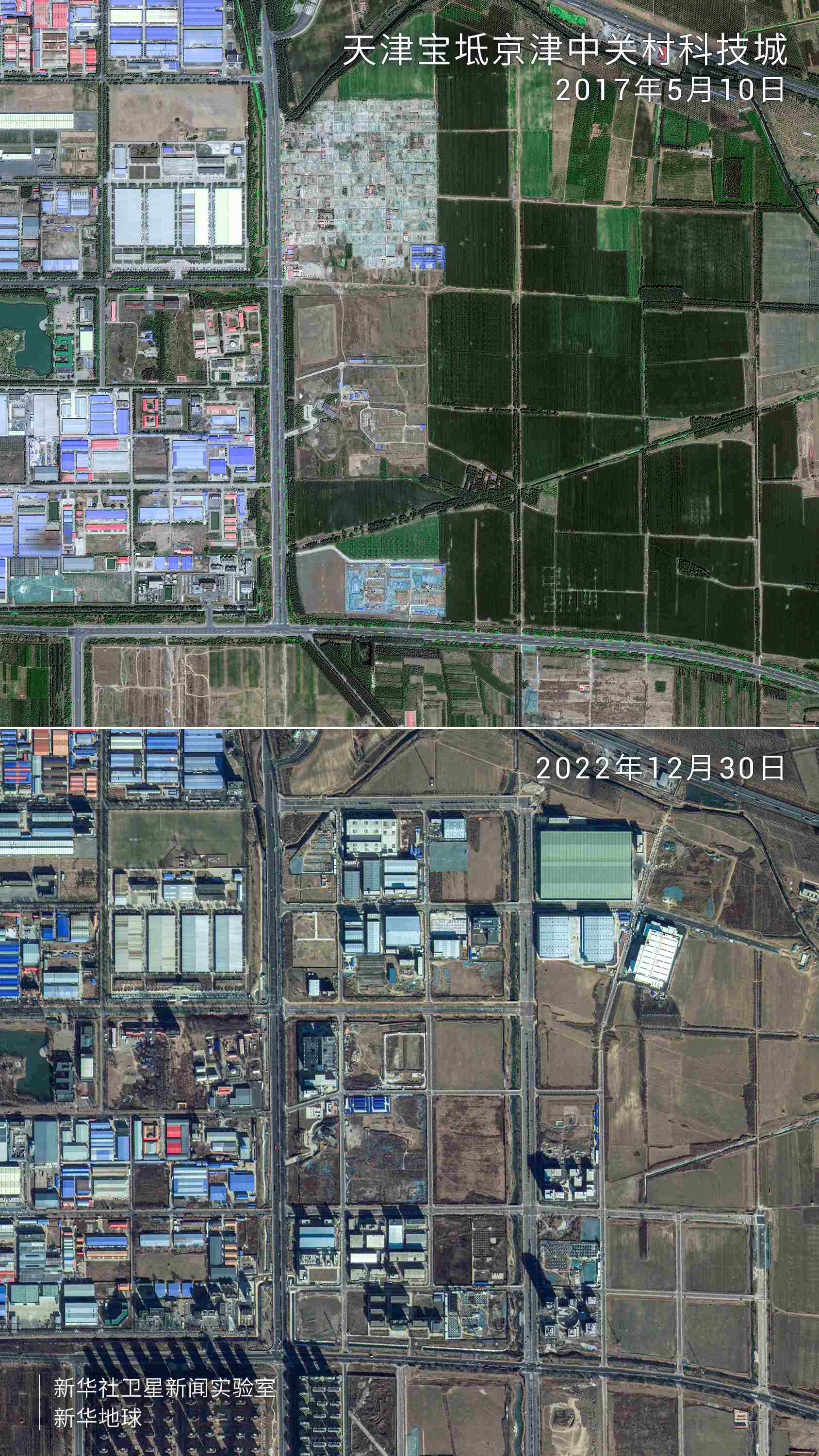 衛(wèi)星拍攝的天津?qū)氎婢┙蛑嘘P(guān)村科技城前后對比圖。