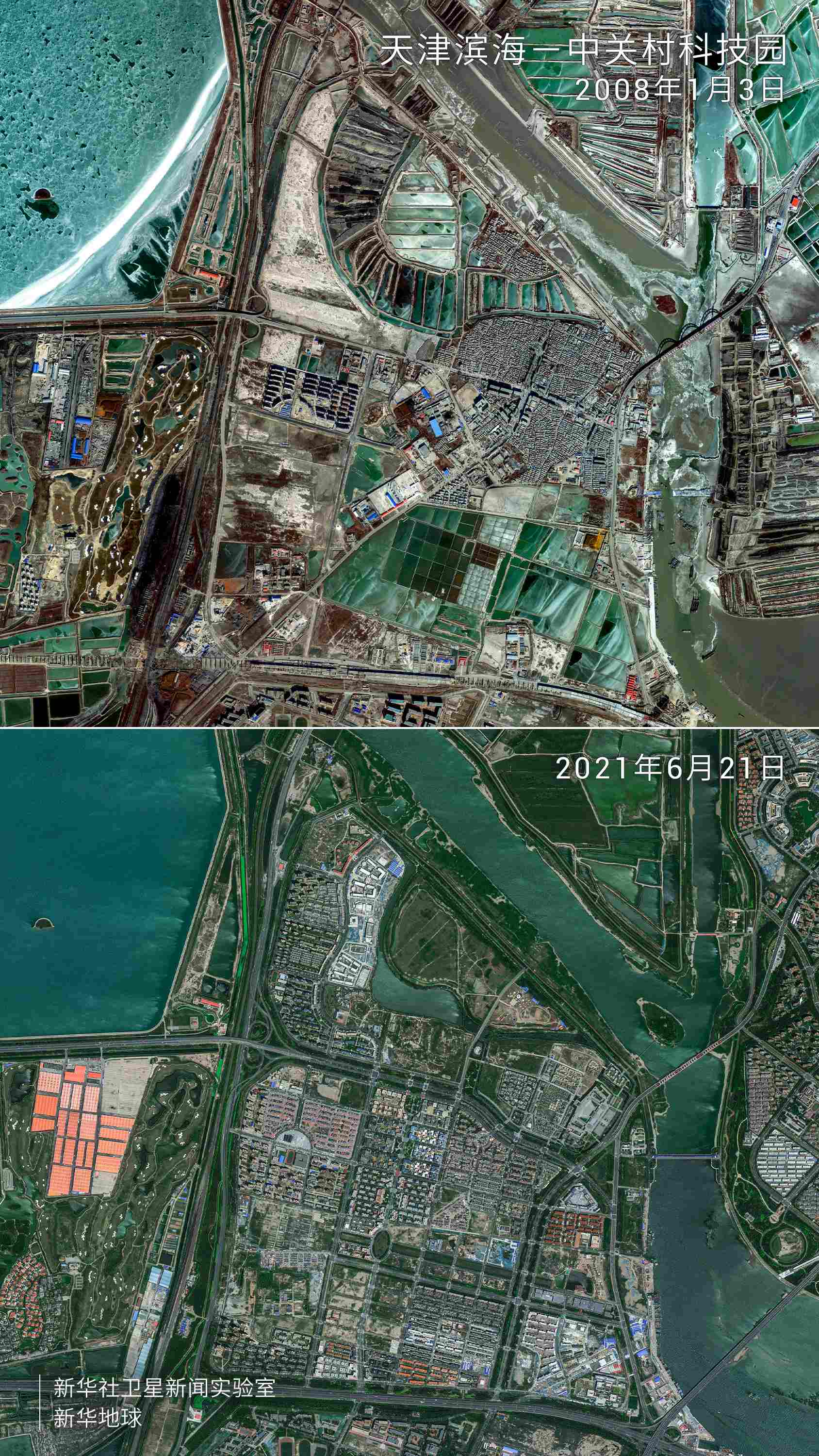 衛(wèi)星拍攝的天津濱海—中關(guān)村科技園前后對比圖。