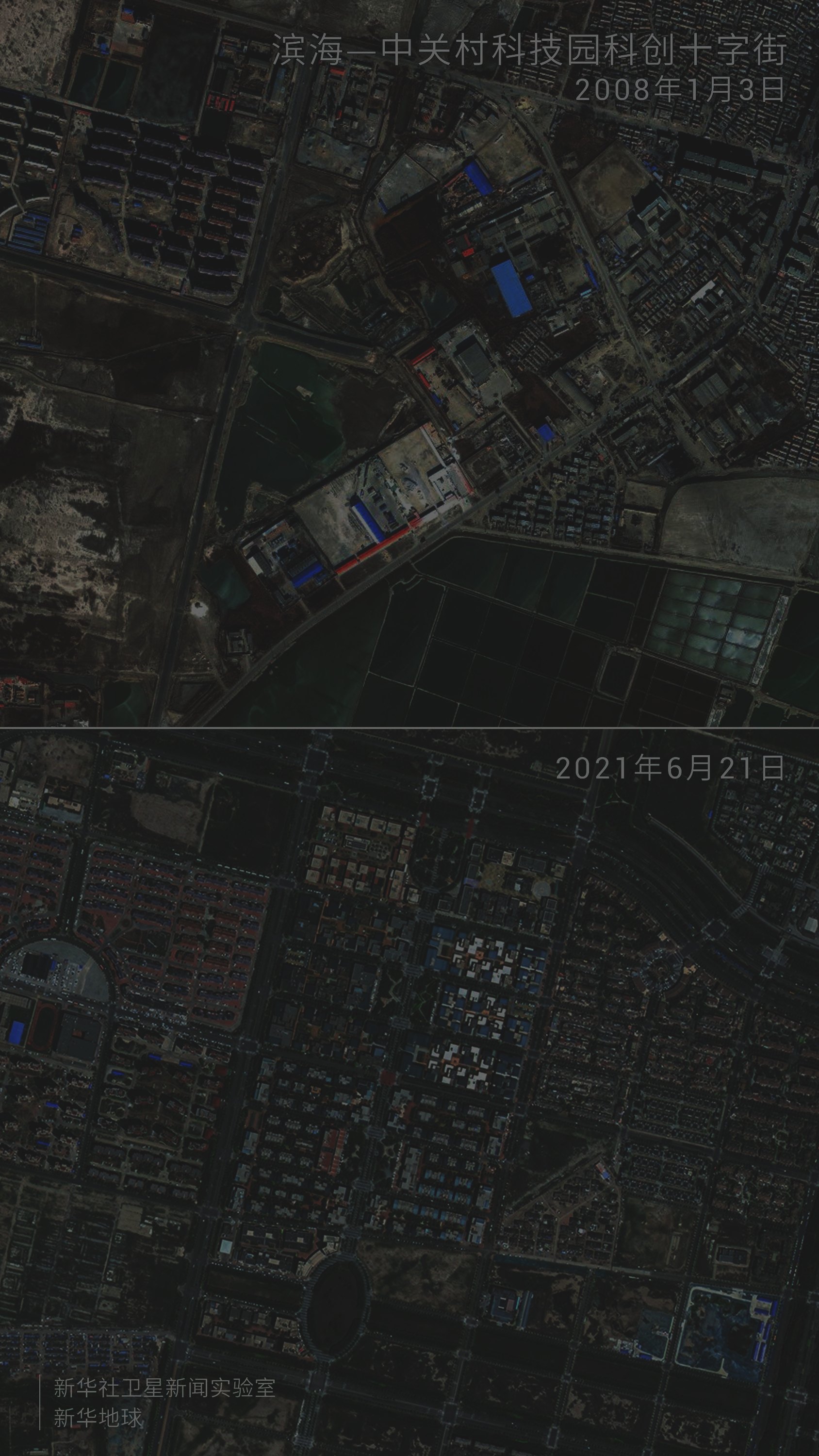 衛(wèi)星拍攝的天津濱?!嘘P(guān)村科技園科創(chuàng)十字街前后對比圖。