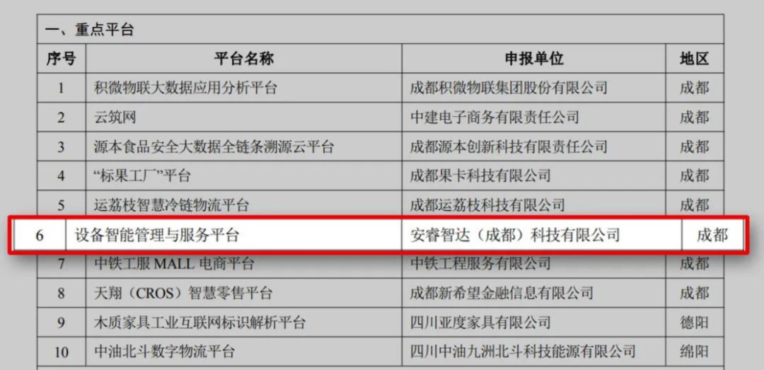 日前,四川省經(jīng)濟和信息化廳對外發(fā)布了《關(guān)于四川省新經(jīng)濟重點平臺和新場景名單(第一批)的公示》。由安睿智達(dá)(成都)科技有限公司自主研發(fā)的“設(shè)備智能管理與服務(wù)”平臺,獲選為10個四川省首批新經(jīng)濟重點平臺之一。