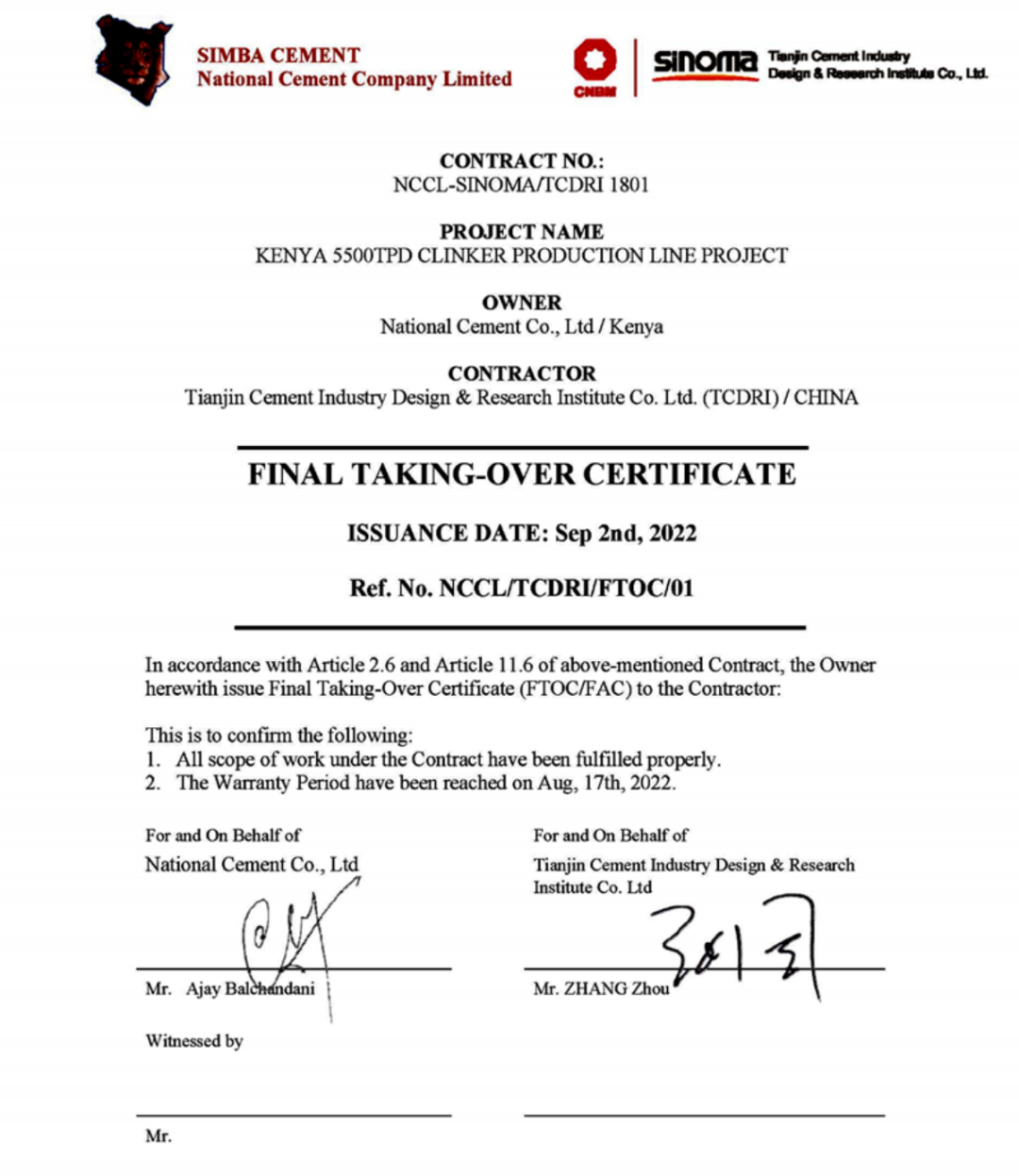 近日,由天津水泥院總承包的肯尼亞NCCL日產(chǎn)5500噸熟料線項目以及粉磨站項目收到了業(yè)主簽發(fā)的FAC證書,標(biāo)志著項目合同履約圓滿完成。該項目獲得了2022年度建材行業(yè)優(yōu)秀工程設(shè)計獎一等獎。