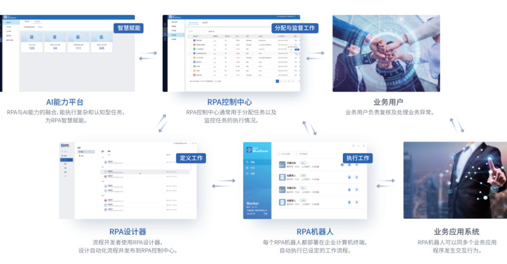 天喻BlueDocerRPA深度融合自研人工智能技術(shù),可模擬人在數(shù)字化設(shè)備中的操作,進行復(fù)雜場景的智能決策,減少人為重復(fù)、繁瑣、大批量的工作任務(wù),真正滲透到企業(yè)的財務(wù)管理、運營管理、客服服務(wù)、人力資源、風(fēng)控內(nèi)審以及進銷存等應(yīng)用場景,提升業(yè)務(wù)流程的自動化、數(shù)字化和智能化水平。
