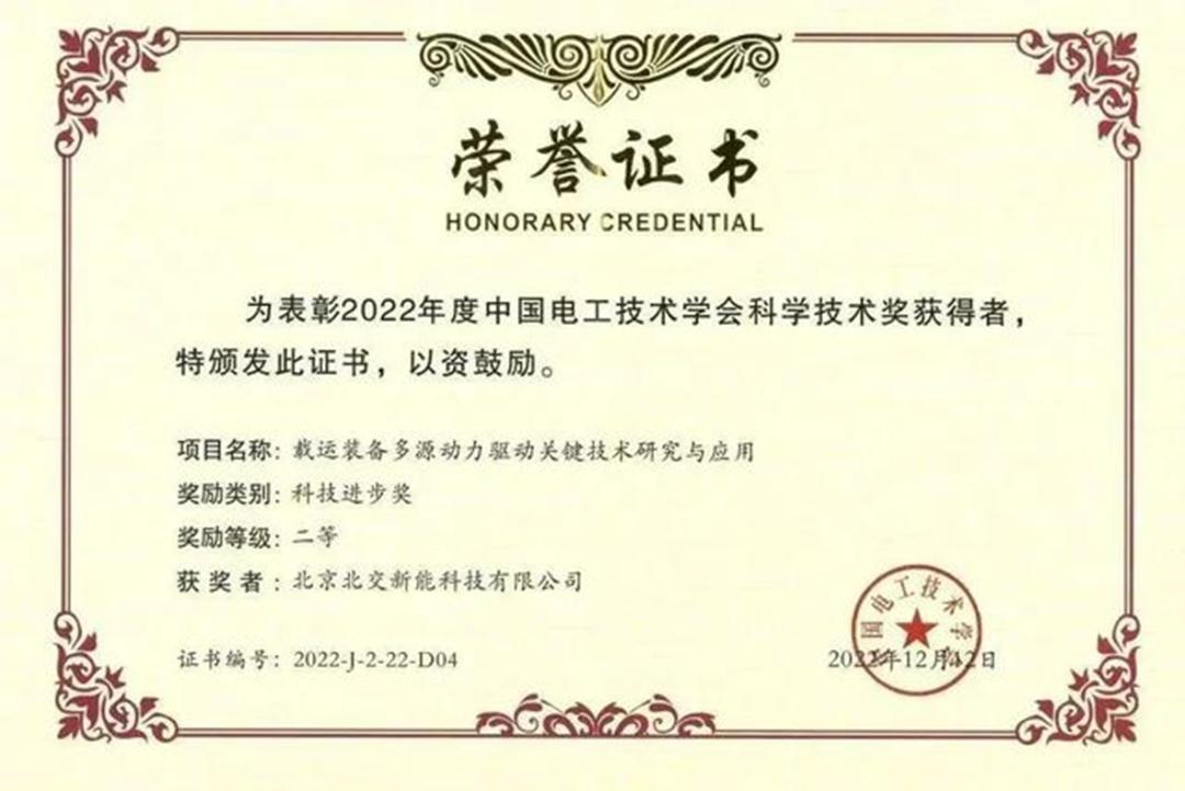 2022年底,中國電工技術(shù)學(xué)會“2022年科技進(jìn)步獎評選”公布,北交新能“運(yùn)載裝備多源動力驅(qū)動關(guān)鍵技術(shù)研究與應(yīng)用”項(xiàng)目榮獲中國電工技術(shù)學(xué)會科技進(jìn)步二等獎。