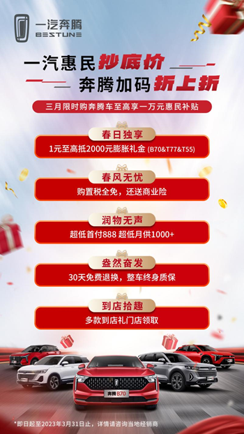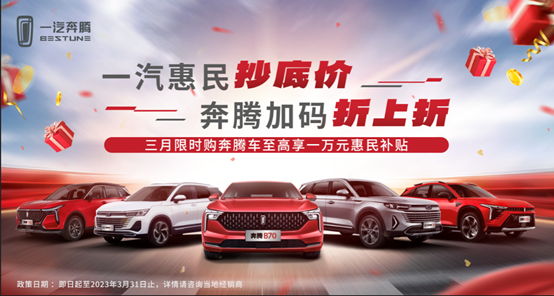 目前,一汽奔騰在售車型覆蓋了8-18萬價(jià)格區(qū)間,擁有B系列車型B70、B70S,T系列SUV車型T55、T77、T99,可滿足不同使用需求、不同價(jià)格需求用戶。此次活動(dòng)多重購車政策疊加,可以說是一汽奔騰回饋省內(nèi)用戶的超級(jí)福利。