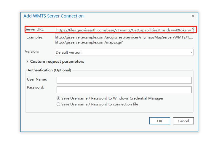 添加WMTS Server,填入元數(shù)據(jù)查詢(xún)地址,將token參數(shù)替換為您自己的token,其他項(xiàng)保持默認(rèn)。