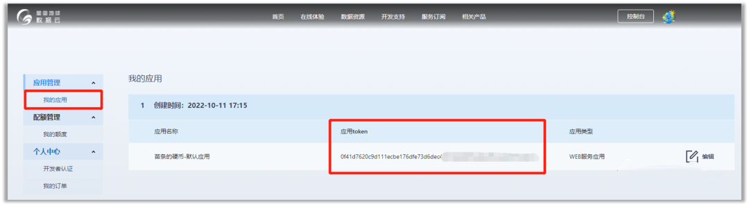 在右上角【控制臺(tái)】里,在【我的應(yīng)用】一欄可以看到認(rèn)證成功后自動(dòng)為我們創(chuàng)建的一個(gè)默認(rèn)應(yīng)用,應(yīng)用的token(即我們常說(shuō)的密鑰)非常重要。