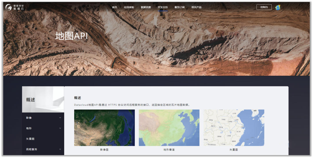 回到官方的【開(kāi)發(fā)支持】界面,在【地圖API】中,我們能夠調(diào)用的數(shù)據(jù)有星圖地球數(shù)據(jù)云影像圖、地形暈渲圖、矢量圖、以及高程數(shù)據(jù)服務(wù)。