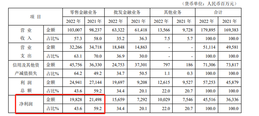 不過,2022年該行的零售業(yè)務(wù)利潤和利潤占比都出現(xiàn)了下滑。