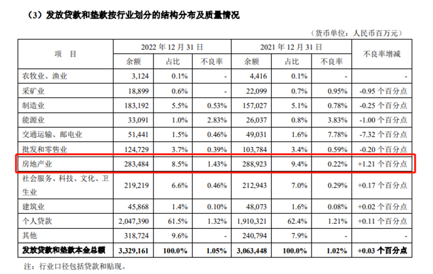 從對(duì)公業(yè)務(wù)風(fēng)險(xiǎn)來看,該行房地產(chǎn)業(yè)不良率出現(xiàn)了增長,同比上升1.21個(gè)百分點(diǎn)至1.43%。