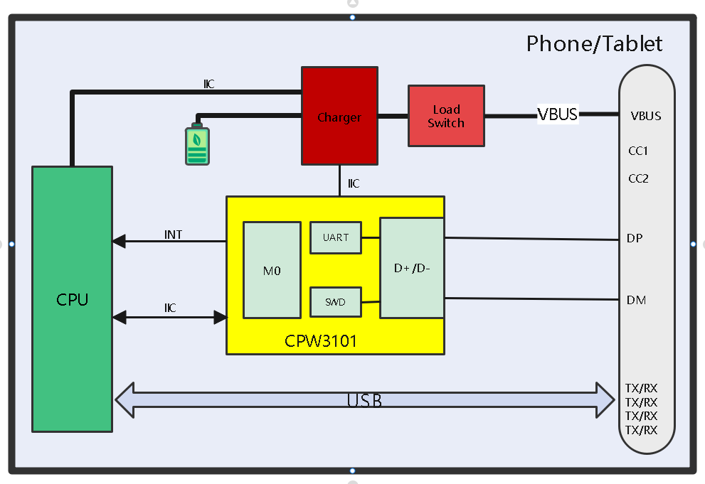 CPW3101的D+/D-分別與USB Typec接口的DP/DM相連接進行UFCS協(xié)議握手、溝通,進行電源協(xié)商,在完成電源協(xié)商獲得VBUS后,即可通過load switch 控制VBUS給charger供電,從而實現(xiàn)智能手機、平板及筆記本電腦等移動智能終端產品的UFCS快速充電。