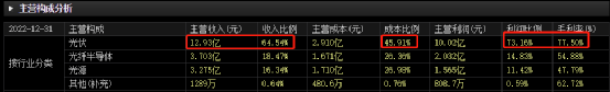 實際上,按行業(yè)分,光伏貢獻了公司65%的營收,但成本比例只有45.9%,利潤比例為此占到73%,毛利率高達77%。