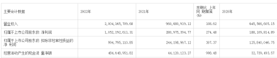 公司2022年實現營業(yè)收入達到20億元,同比增長108%,跟2020年相比更是大增超200%;實現凈利潤10.52億元,實現扣非凈利潤9.95億元,上述數據同比和與2020年相比的增速分別為274%、459%及307%、690%。